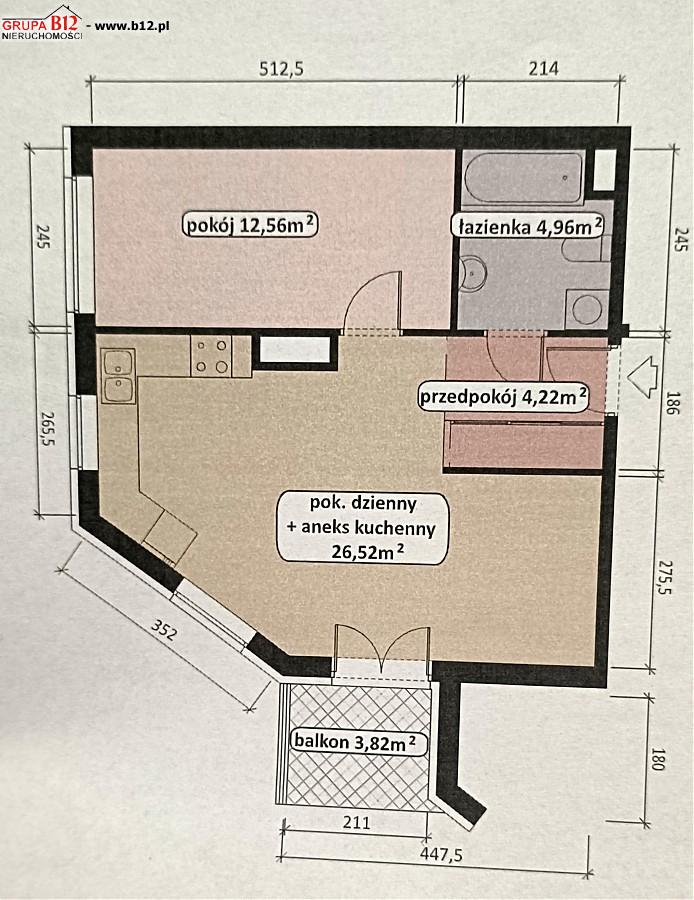 ·         jasny salon z aneksem kuchennym o powierzchni 26,52 m².