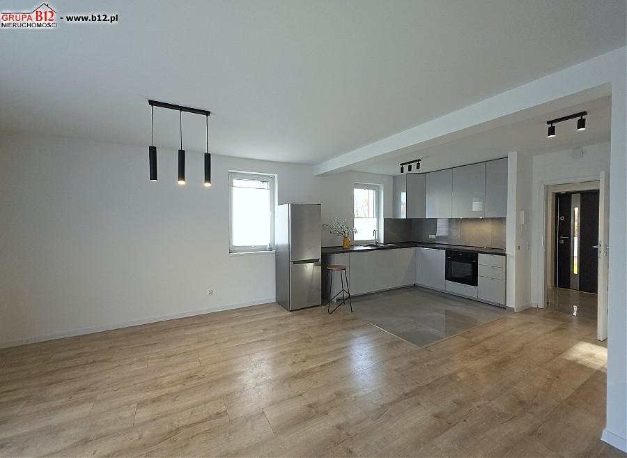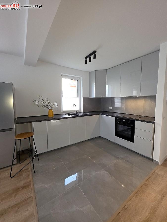 Kuchnia wyposażona jest we wszystkie najpotrzebniejsze sprzęty AGD takie jak piekarnik, zmywarka, okap, lodówka z zamrażarką. W salonie znajduje się duża sofa, duża przestrzeń w salonie pozwala na aranżację jadalni.